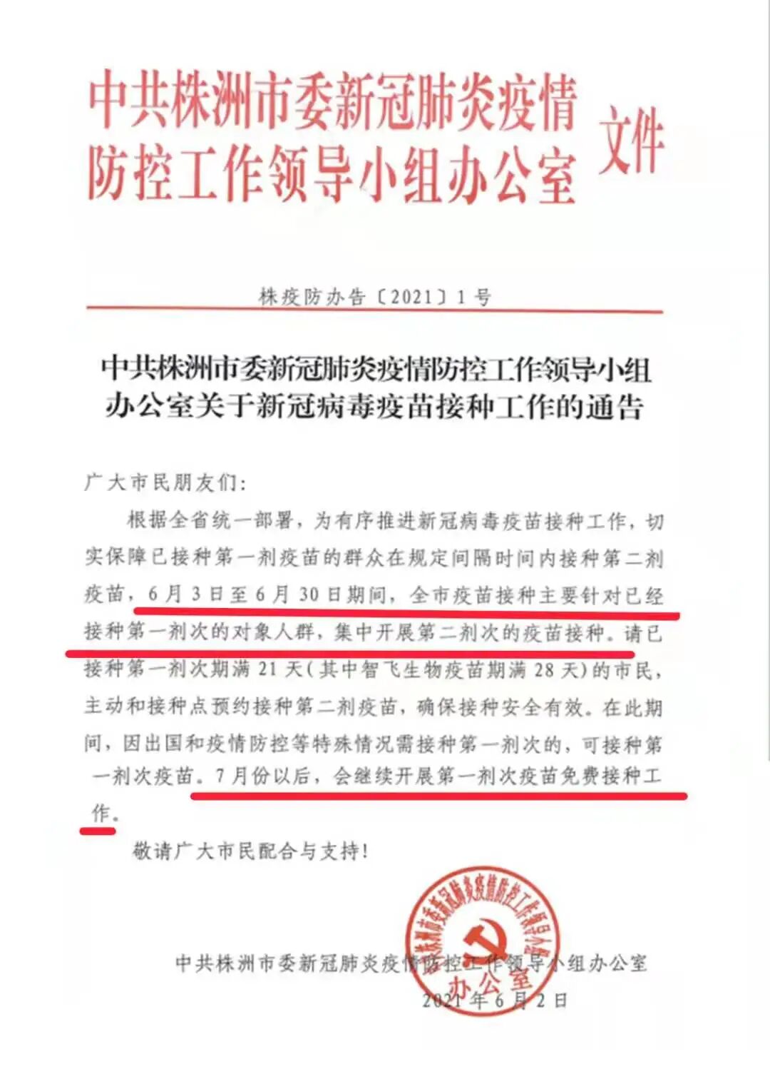 感谢您对我院的信任,选择在我院疫苗接种点进行接种,下面转发《中共株洲市委新冠肺炎疫情防控工作领导小组办公室关于新冠病毒疫苗接种工作的通知》,请您仔细阅读,感谢配合!